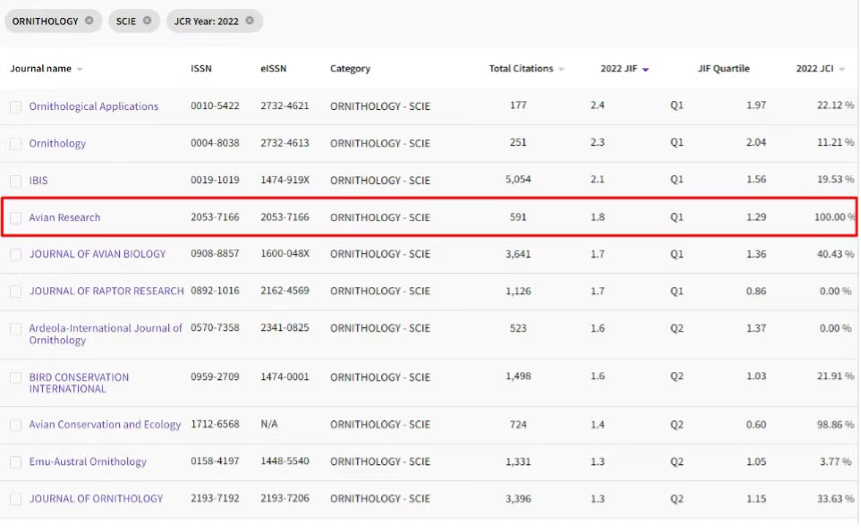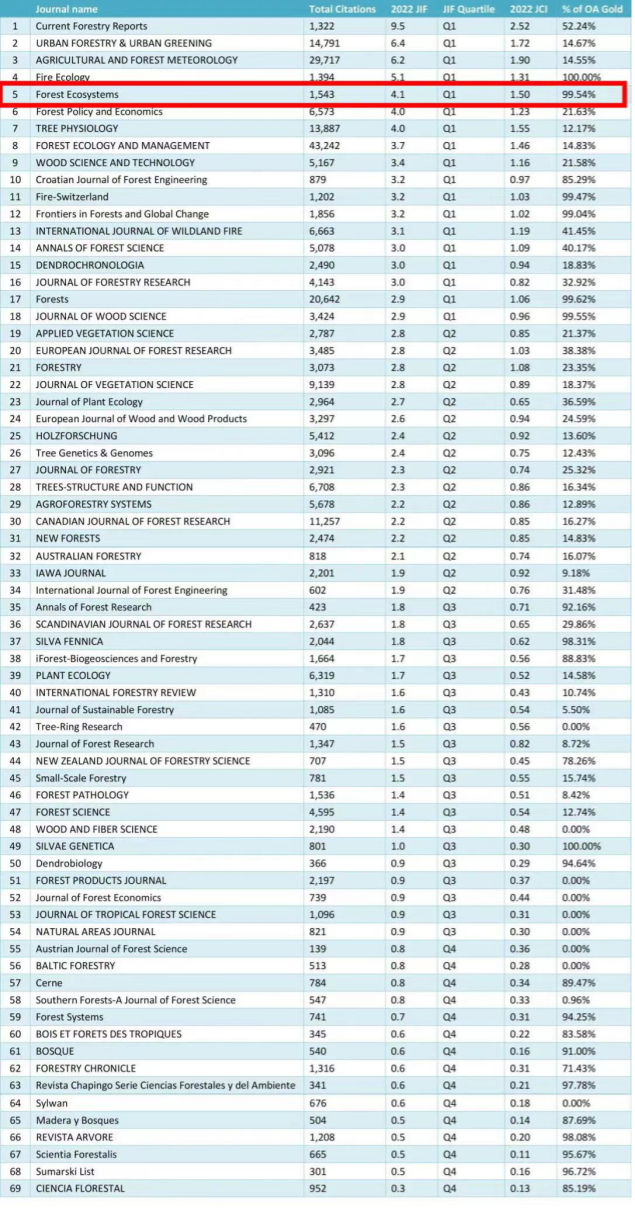 The Impact Factor of Forest Ecosystems reaches 4.1, ranking 5 among 69 SCIE journal of forestry indexed in JCR™ and 3 places higher than last year; The Impact Factor of Avian Research reaches 1.8, ranking 4 among 29 SCIE journal of forestry indexed in JCR™ and 2 places higher than last year;