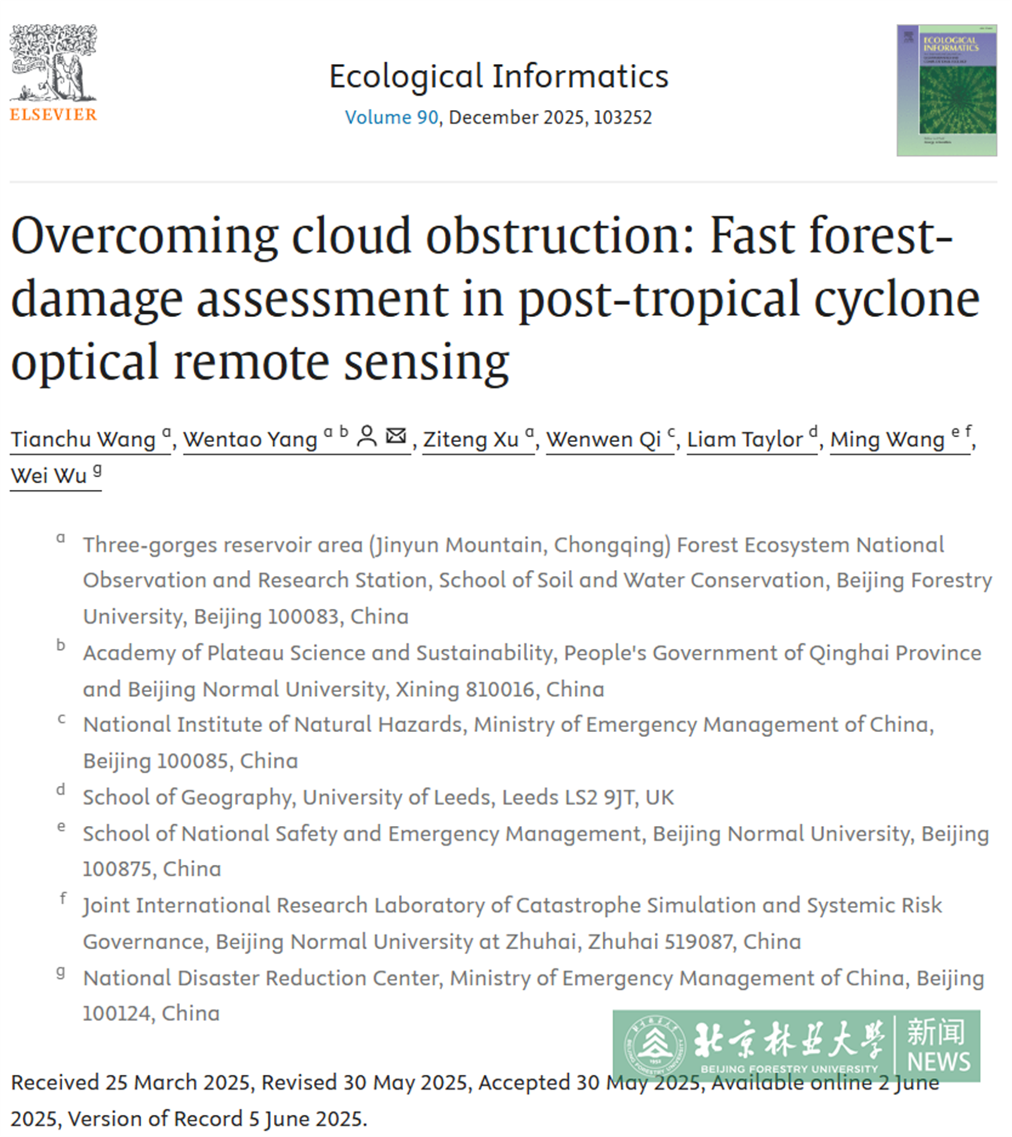 A research team led by Associate Professor Yang Wentao from the School of Soil and Water Conservation has published a study in Ecological Informatics, a leading journal in environmental informatics. Their paper, titled "Overcoming cloud obstruction: Fast forest-damage assessment in post-tropical cyclone optical remote sensing", presents a significant advancement in rapidly assessing forest damage after natural disasters.
