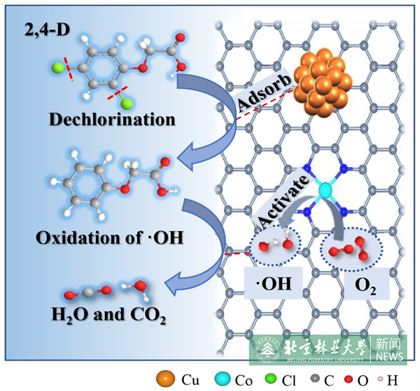 Lately, results of the research team led by Professor Wang Hui from College of Environmental Science and Engineering entitled "Enhanced electrocatalytic cathodic degradation of 2,4-dichlorophenoxyacetic acid based on a synergistic effect obtained from Co single atoms and Cu nanoclusters" was published in top journal of environmental circle Applied Catalysis B: Environmental (IF=24.319). The first author of the article is Liu Lu, graduate student from College of Environmental Science and Engineering, and Beijng Forestry University is the signature unit of the first author.