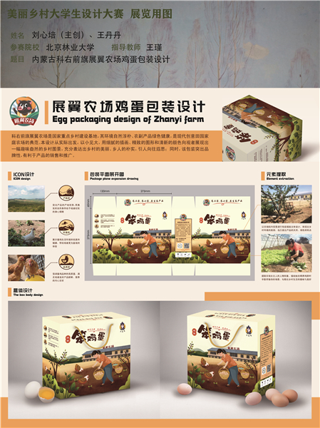 “ Egg Packaging Design  for   t he Zhan y i Farm of Horqin Right Front Banner in Inner Mongolia ”, a project completed by BFU team under its Poverty Alleviation through S&T initiative, was recently awarded gold medal in the first “Beautiful Countryside” Art Competition. the poverty elimination project of our university, was awarded the gold medal.