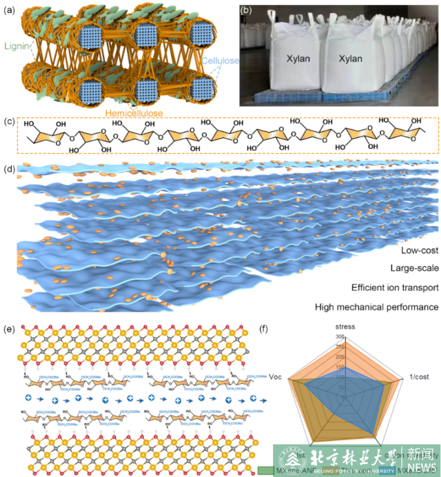 Xylan, a common by-product in the process of dissolved pulp production in Chinese pulp and paper industry, is featured by its low branching degree, regular molecular chain structure, high crystallinity after extracted using a concentrated alkali solution approach and is almost insoluble in various common solvents. The high-performance utilization of xylan has been seriously affecting the industry development, and is one of the urgent problems to be solved in the high-performance utilization of forest biomass resources. As a result, the research team led by Professor Pengfeng successfully designed and explored a xylan reinforced nanofluidic membrane that features ultrafast ion transport, excellent water stability, low-cost, and exceptional mechanical strength for the first time.