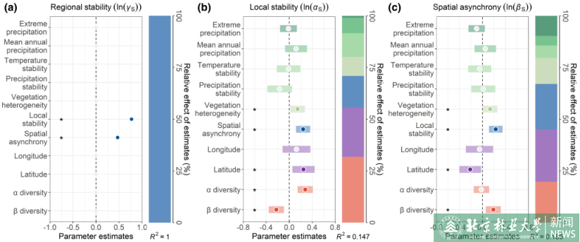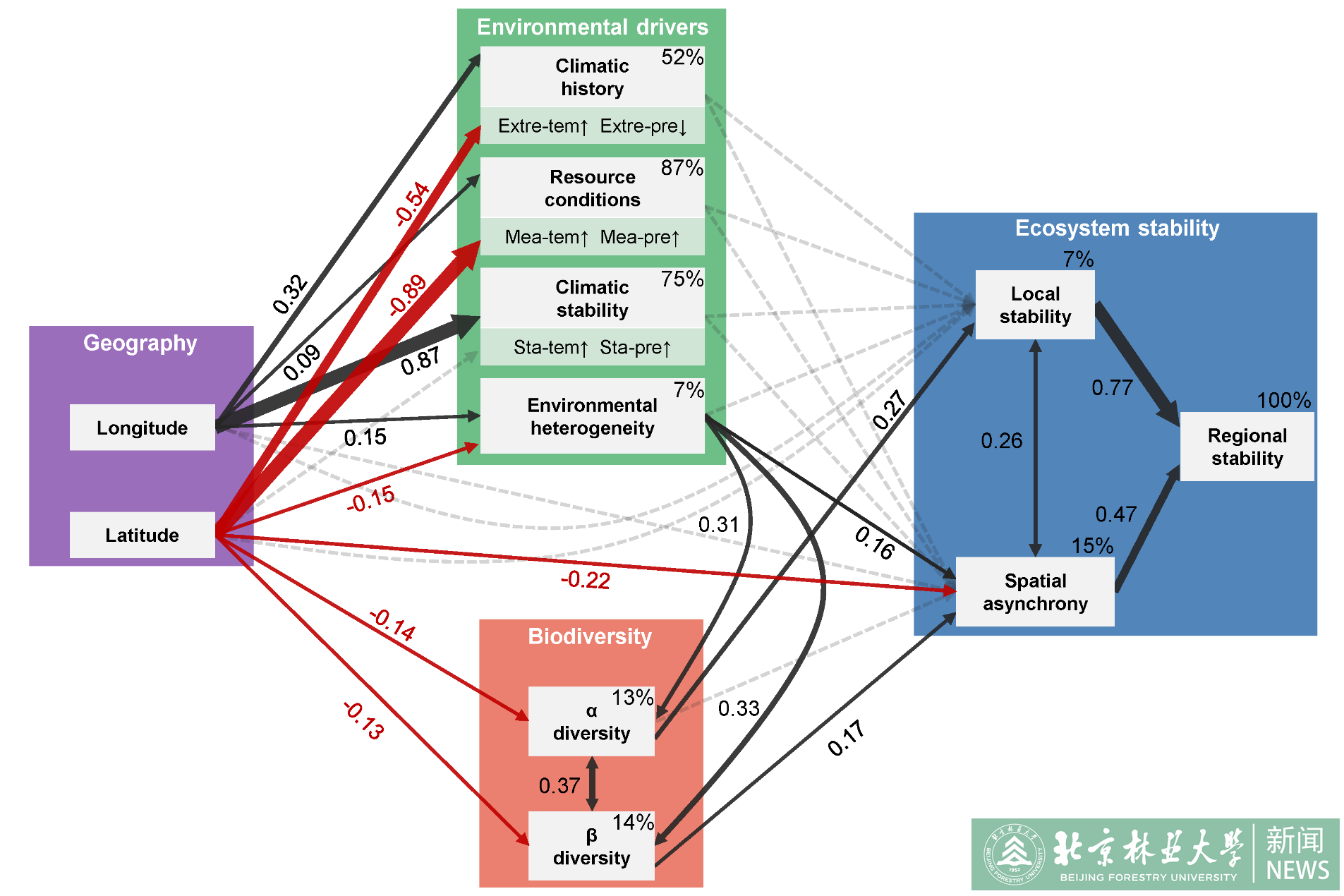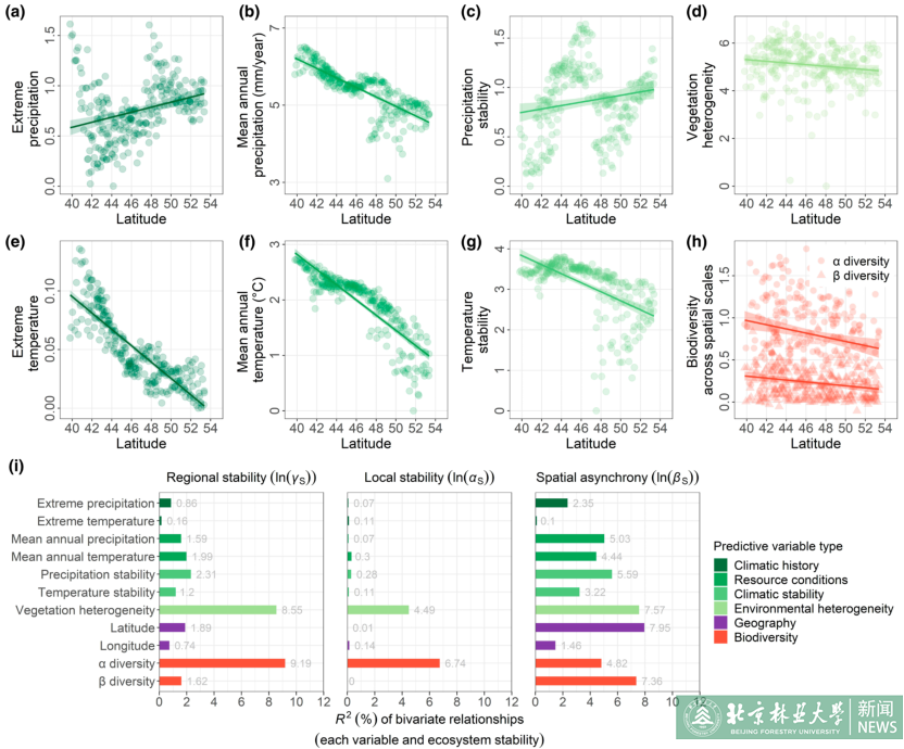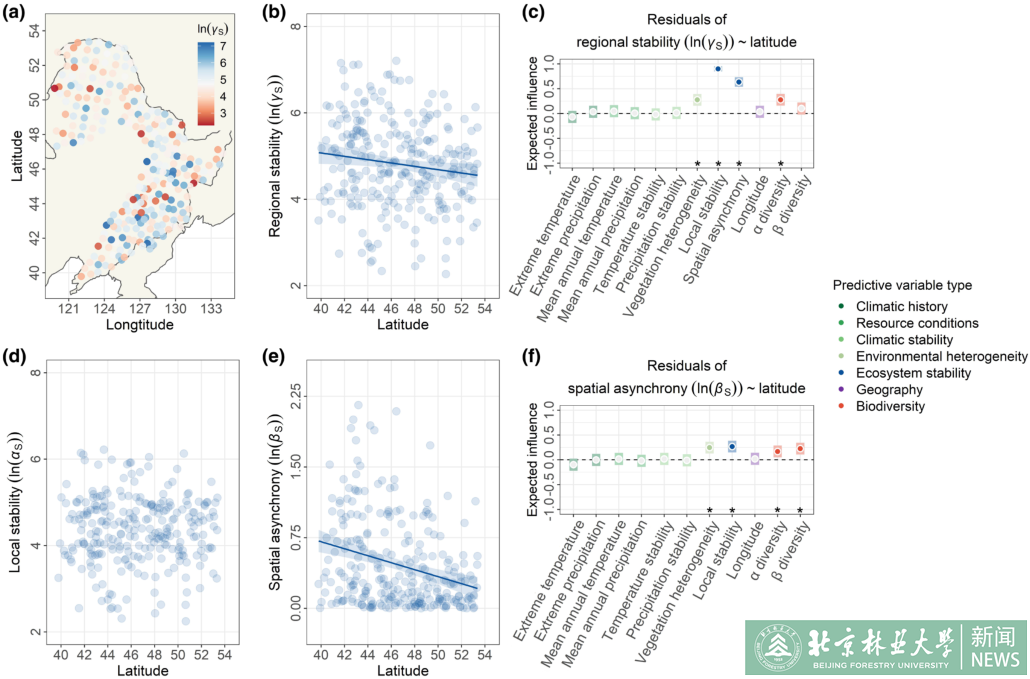 Accordingly, the team of forest management teachers of Beijing Forestry University (Team information: https://mp.weixin.qq.com/s/gGl9im6q-H0JBwZDQq6ruQ) examines the latitudinal patterns of ecosystem stability at the local and regional spatial scale using a natural assembly of forest metacommunities that are distributed over a large temperate forest region, considering a range of potential environmental drivers.