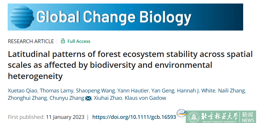 Recently, the latest research result of the College of Forestry entitled “Latitudinal patterns of forest ecosystem stability across spatial scales as affected by biodiversity and environmental heterogeneity” was published in the international top journal of global change industry“Global Change Biology” (Q1, Impact factor: 13.211).