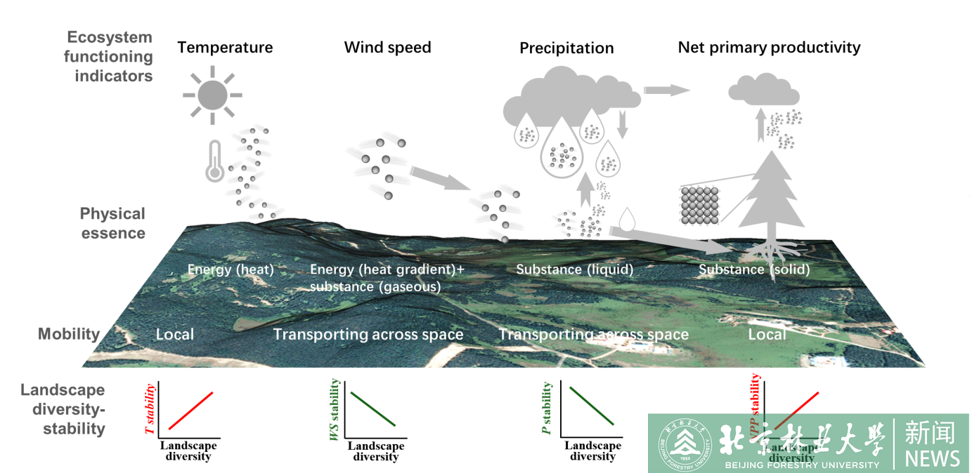 Our results showed that landscape diversity across this forest–grassland ecotone was positively related to the stability of T and NPP, but negatively related to that of WS and P. These opposite patterns may be explained by the differential nature of ecosystem variables, namely whether they involve transporting substance across space (WS and P) or not (T and NPP). We also found that as the spatial scale increases, the diversity-stability relationships strengthened for all three climatic variables (i.e., T, P, WS). However, the stabilizing effects of landscape diversity on NPP first increased but then decreased with increasing grain size, peaking at ~ 30 km.