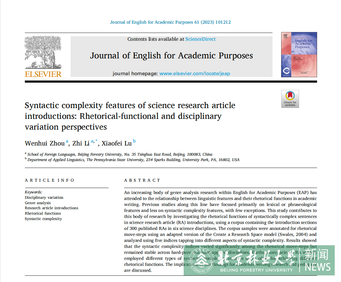 Recently, the latest research result of the School of Foreign Languages “Syntactic complexity features of science research article introductions: Rhetorical-functional and disciplinary variation perspectives” was published in the Journal of English for Academic Purposes (SSCI, linguistics category Q1, Impact factor: 2.811). The first author of this research article is Zhou Wenhui, a graduate student majored in Applied Linguistics from the School of Foreign Languages of BFU. The corresponding author is Professor Li Zhi, Dean of the School of Foreign Languages of BFU. The research article was co-supervised by Professor Lu Xiaofei from Pennsylvania State University.