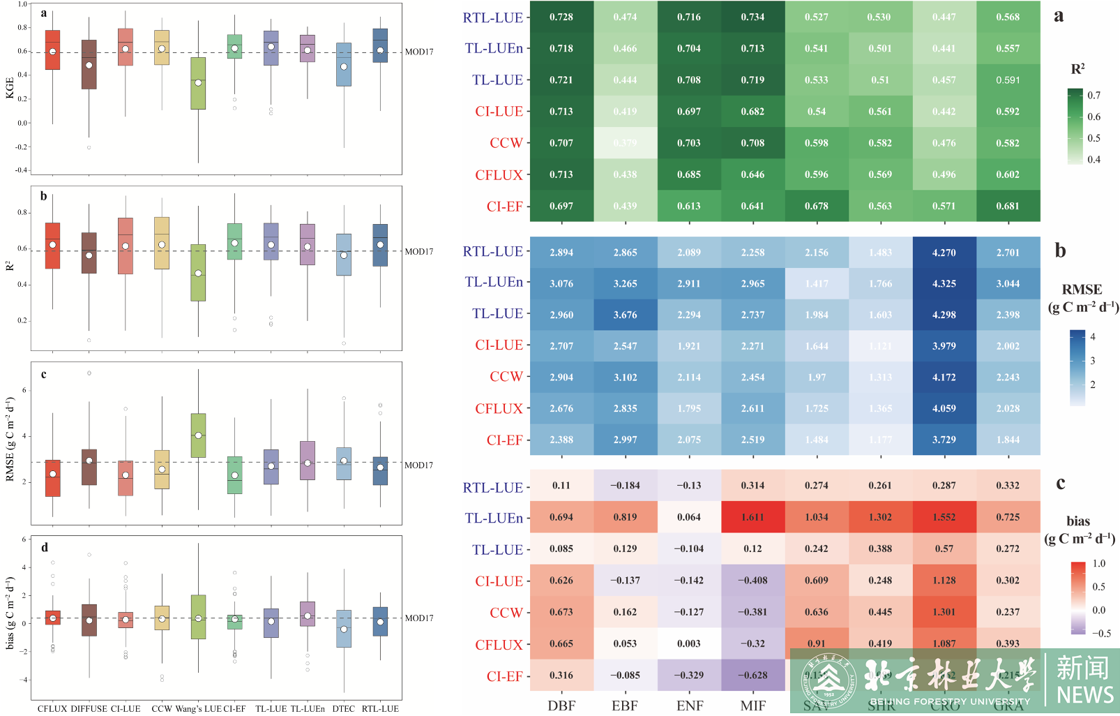 To address this issue, the research team utilized multi-source data (e.g., carbon flux, meteorological, and vegetation information) from 102 global terrestrial ecosystems and 950 site-years to conduct a global assessment of the simulation results from ten widely-used LUE models (CFLUX, DIFFUSE, CI-LUE, Wang's Model, CI-EF, TL-LUE, TL-LUEn, DTEC, and RTL-LUE).