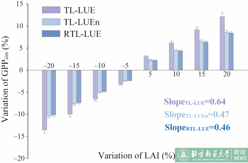 Figure 3 Sensitivity of GPP simulated by "Two-leaf" models to Leaf Area Index (LAI)