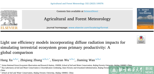 Recently, the prestigious journal in the field of agricultural and forestry science, Agricultural and Forest Meteorology, published an academic paper “Light use efficiency models incorporating diffuse radiation impacts for simulating terrestrial ecosystem gross primary productivity: A global comparison” online by Professor Zhiqiang Zhang's research team from the School of Soil and Water Conservation at Beijing Forestry university. Dr. Hang Xu, a young faculty from the School of Soil and Water Conservation, is the paper's first author, while Prof. Zhiqiang Zhang serves as the corresponding author.